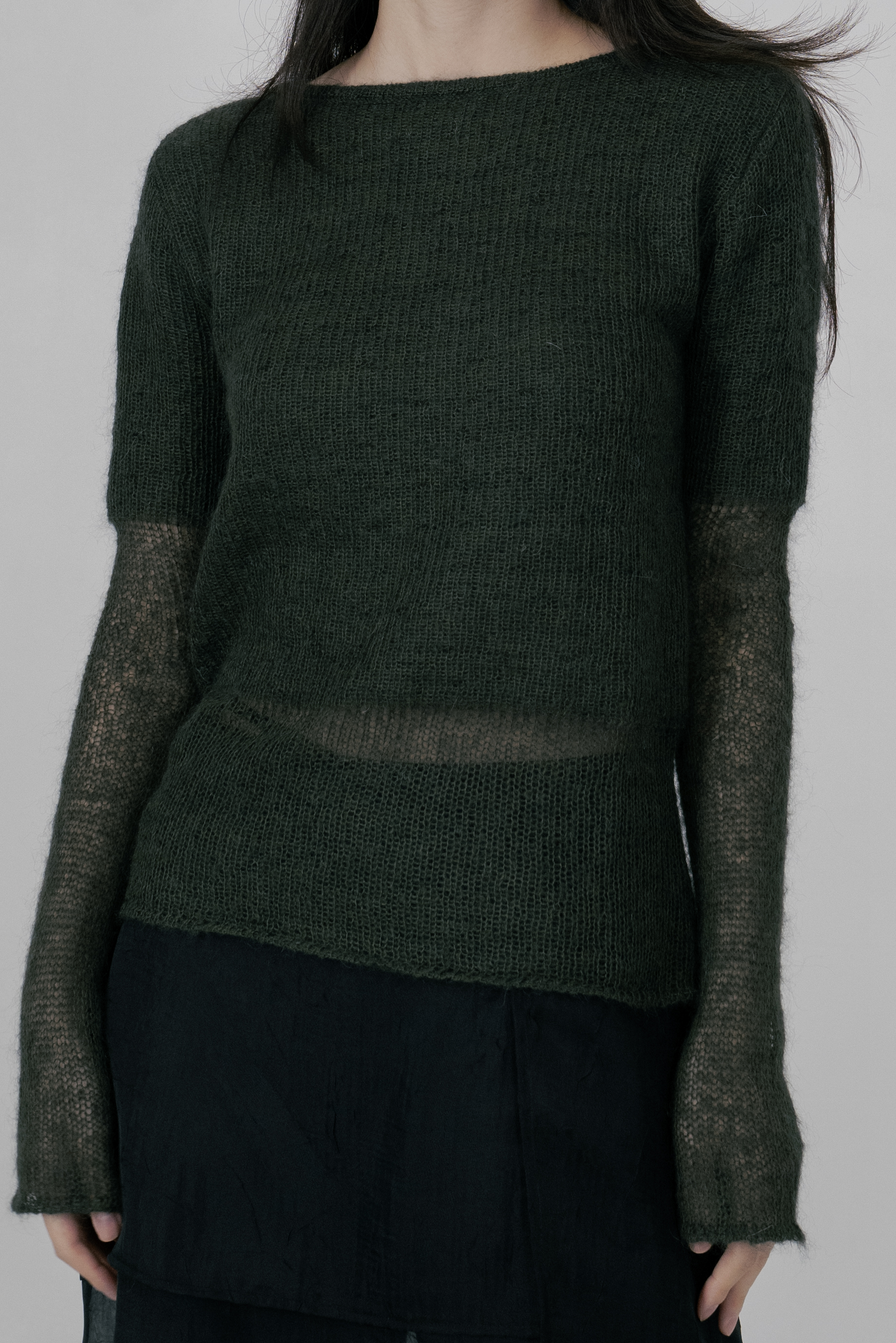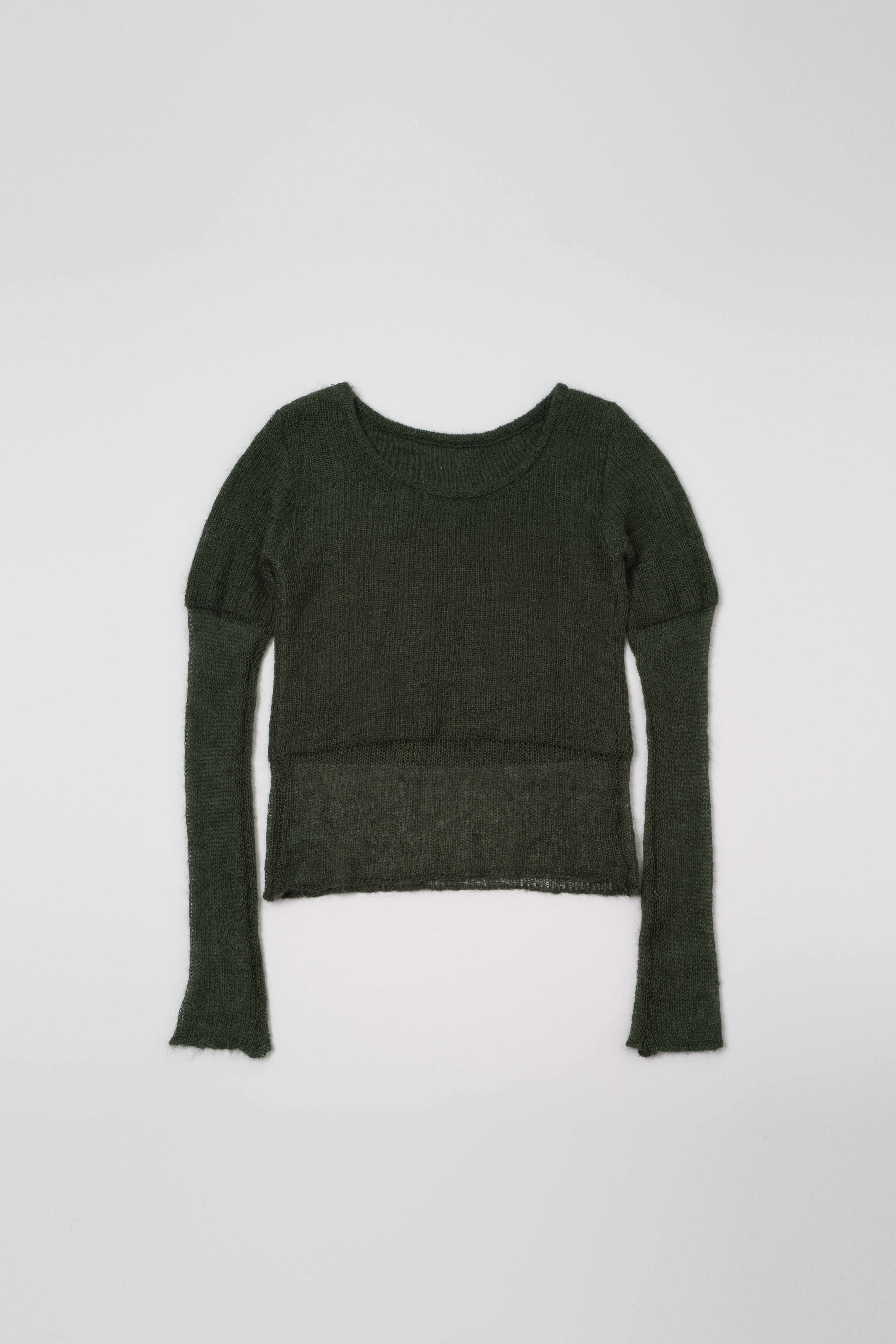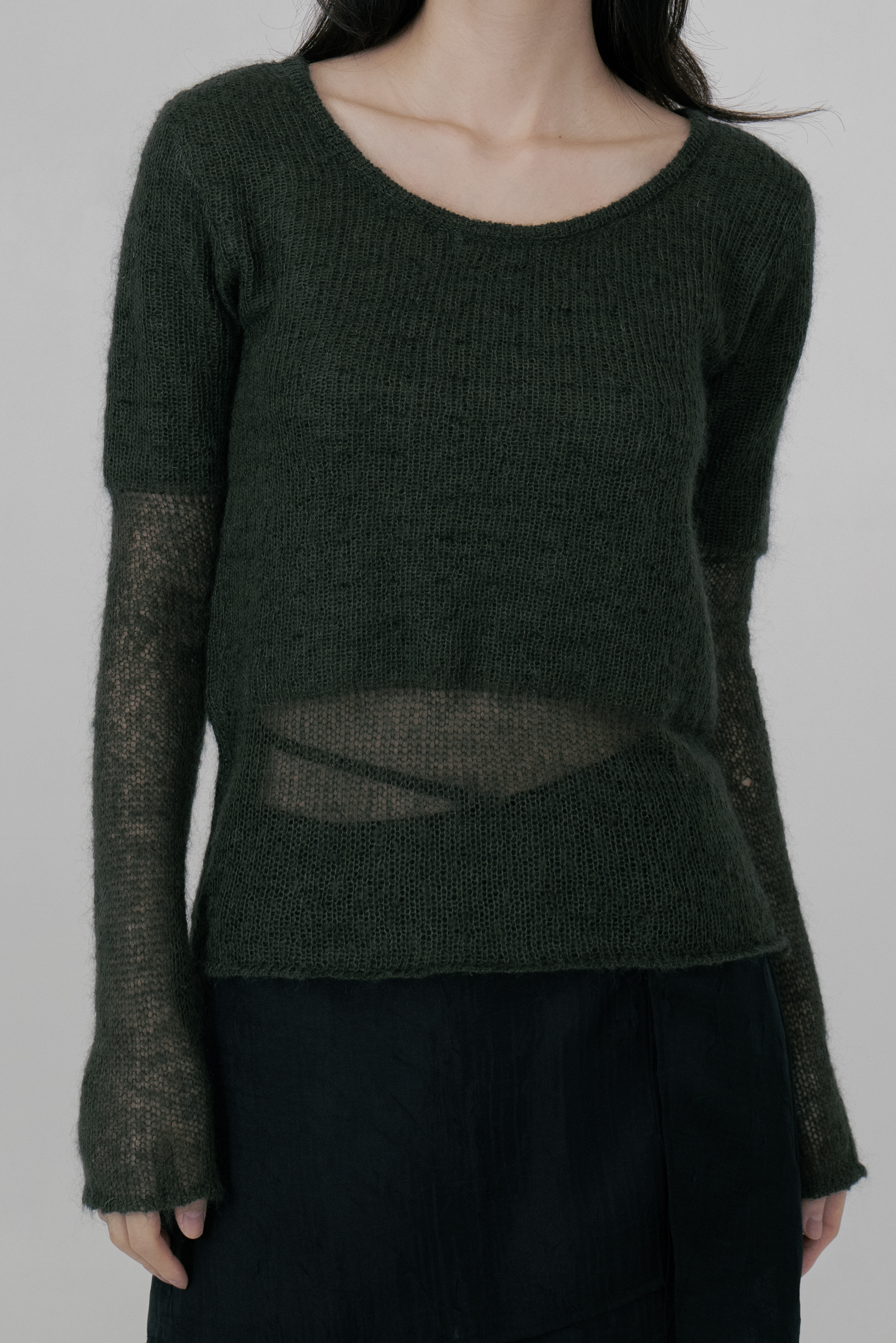 - 이편직으로 제작하여 소매와 몸판의 밑단 부분을 얇게 짜 레이어드 니트로 연출